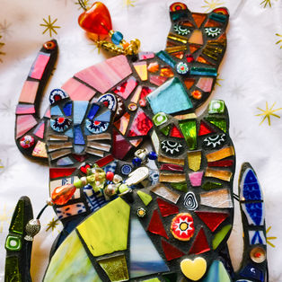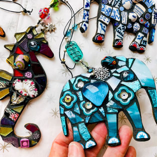 The range of Festive Hangers comprise of Seahorses, Ponies, Cats, Elephants, Crowns, Giraffes, Circles, Butterflies and Dragonflies. Hand-cut coloured mirror and vitreous glass in unique colours & patterns adorned with millefiori, glass beads and metal charms. These mini-mosaics measure around 13 x 13 cm and are set on a wooden base, grouted, and painted gold on the reverse before signature and individually numbered.